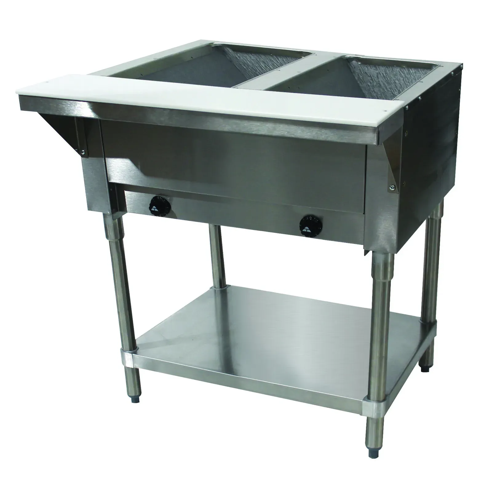 Constructed with a durable stainless steel top, this hot food table is built to withstand the rigors of daily use. The stainless steel 8D support shelf, complete with a removable 3/8" thick poly cutting board, provides additional workspace and convenience. The galvanized open base with an undershelf offers ample storage for kitchen essentials, enhancing overall efficiency.