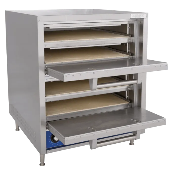The Bakers Pride® model P44S oven is a great choice for fresh-dough pizza, prebaked crust, pretzels, flatbreads, and other bakery products. Bake directly on the deck or on screens, pans, or baking sheets. This oven has two independently controlled cooking chambers, each featuring two Cordierite decks and 3.25" deck heights. Each chamber also has a 15-minute, electric timer with continuous-ring alarm and manual shut-off. This oven comes standard with a stainless steel exterior and 4” adjustable legs. International voltages are available. Ovens are stackable.