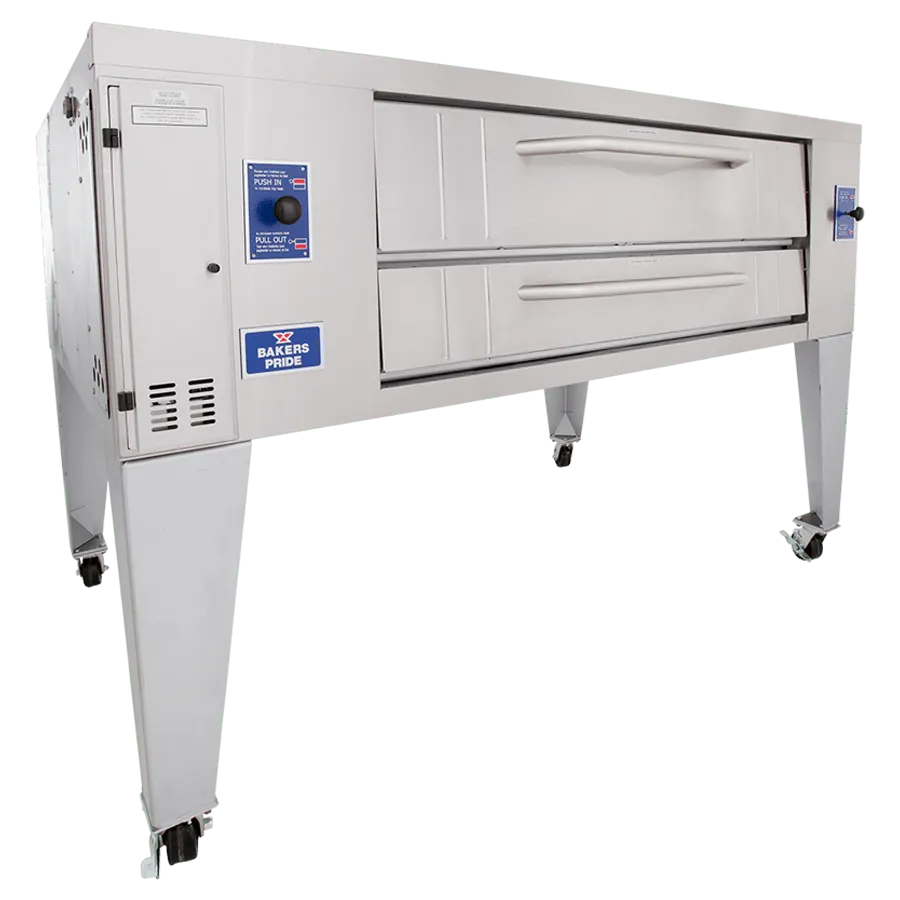 The Bakers PrideĀ® model Y-800 extra-wide pizza oven is perfect for high-volume baking operations. This model is constructed with heavy-duty, .25" angle iron frame, which is fully welded to allow for double-stacking or stacking under an Il Forno Classico. The oven chamber features a Lightstone fibrament deck with 8" deck height and independently controlled top and bottom heat dampers for perfectly balanced results. The oven exterior is all heavy-duty, stainless steel and fully insulated for cooler outer temperatures and consistent interior temperatures.