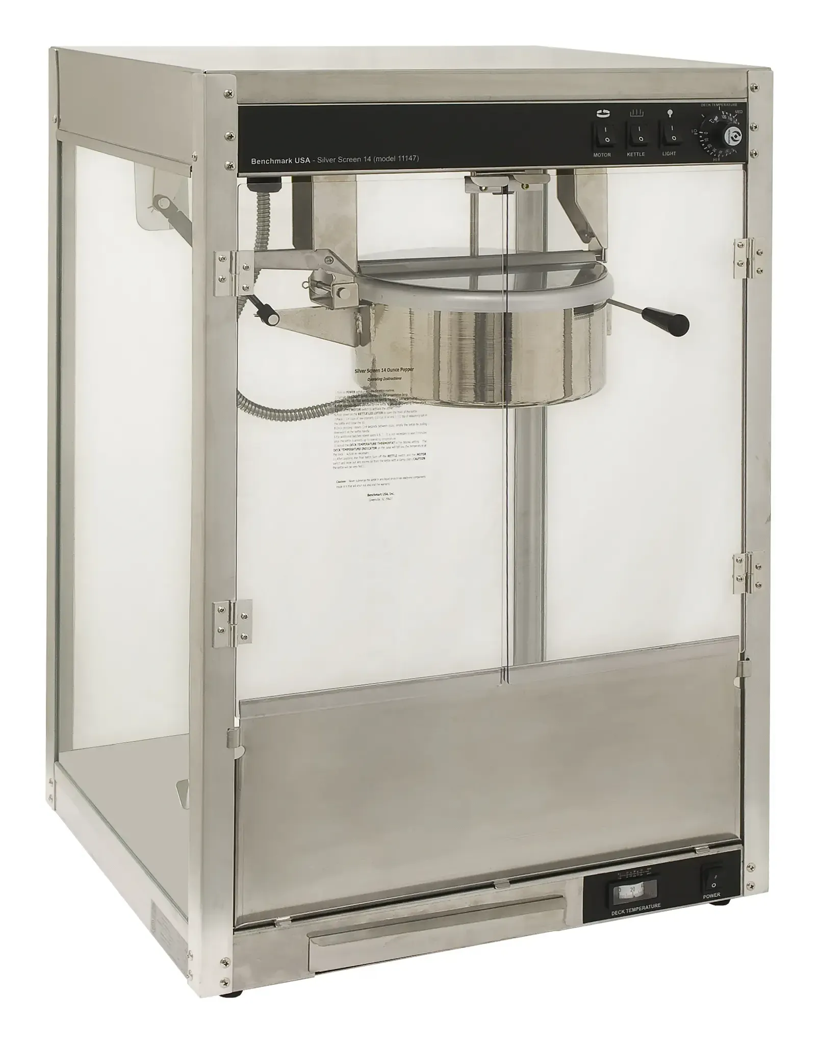 Supplies that elevate your popcorn experience. Introducing the Benchmark USA, 11147, Silver Screen Popcorn Machine. Designed for commercial restaurant use, this popcorn machine is a game-changer for your business. With its 14oz kettle, it can produce large quantities of delicious popcorn in no time. The 120v power ensures efficient and consistent popping, allowing you to serve your customers quickly. The Silver Screen Popcorn Machine is packed with features that make it perfect for a commercial restaurant setting. Its sleek design adds a touch of elegance to your establishment, while the easy-to-use controls make operation a breeze. The Benchmark USA popcorn machine is built to last, with durable construction that can withstand the demands of a busy restaurant. Elevate your popcorn offerings and impress your customers with the Benchmark USA, 11147, Silver Screen Popcorn Machine.