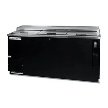 Invest in superior quality with the Beverage Air DW79HC-B Bottle Cooler. This sleek and efficient cooler is designed to meet the demands of a busy commercial restaurant. With its deep well design and three sliding lids, it offers easy access to a generous 24.1 cu. ft. of storage space. The adjustable epoxy coated wire dividers allow for flexible organization, accommodating up to 32 cases of 12 oz. bottles or 45-3/4 cases of 12 oz. cans. The electronic controls ensure precise temperature management, while the self-contained refrigeration system with R290 hydrocarbon refrigerant guarantees optimal cooling performance. Made in the USA, this bottle cooler features a stainless steel top for durability, a galvanized interior for easy cleaning, and a black vinyl exterior for a sleek appearance. Complete with a bottle cap opener and cap catcher, the Beverage Air DW79HC-B Bottle Cooler is the perfect addition to any commercial restaurant.