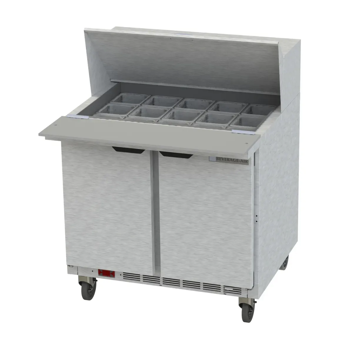 Achieve kitchen supremacy with the Beverage Air SPE36HC-15M Refrigerated Counter, Mega Top Sandwich / Salad Unit. This two-section counter is designed to meet the demands of a busy commercial restaurant. With a spacious 36"W stainless steel top, it can accommodate up to 15 1/6 size pans, making it perfect for storing and organizing ingredients for sandwiches and salads. The top also features a convenient 10" cutting board for food preparation. The stainless steel exterior and aluminum interior ensure durability and easy cleaning. Equipped with rear-mounted self-contained refrigeration, this unit maintains optimal temperature and keeps your ingredients fresh. The SPE36HC-15M uses R290 Hydrocarbon refrigerant, which is environmentally friendly. With its UL EPH Classified and UL-Sanitation certifications, you can trust in the quality and safety of this made in USA product. Upgrade your kitchen with the Beverage Air SPE36HC-15M and streamline your sandwich and salad preparation process.