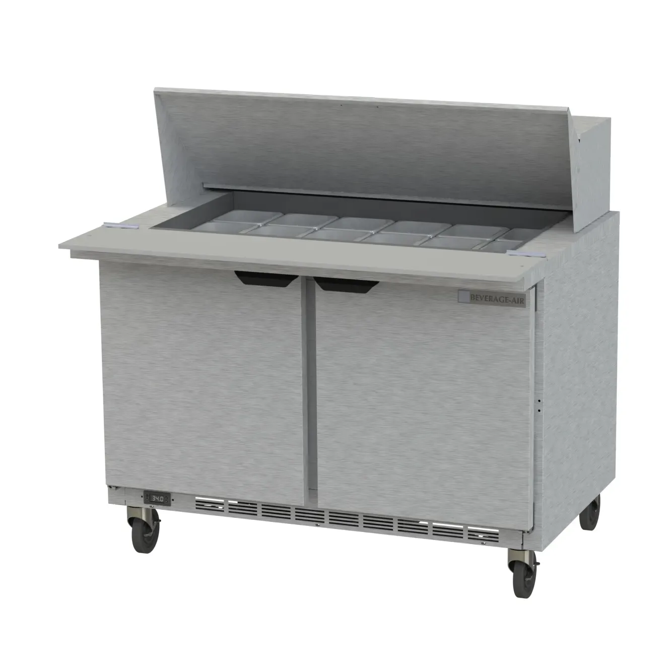 Elevate your cuisine with the Beverage Air SPE48HC-18M Refrigerated Counter, Mega Top Sandwich / Salad Unit. This two-section counter is designed to meet the demands of a commercial restaurant, providing ample storage and preparation space. The stainless steel top features an opening for 18 1/6 size pans, allowing you to easily access and organize your ingredients. With a 10" cutting board and four shelves, you'll have plenty of room to assemble your signature sandwiches and salads. The stainless steel exterior and aluminum interior ensure durability and easy cleaning, while the rear-mounted self-contained refrigeration system keeps your ingredients fresh and cool. The unit is also UL-Sanitation and UL EPH Classified, guaranteeing its safety and quality. Made in the USA by Beverage Air, this refrigerated counter is a reliable and efficient addition to any commercial kitchen.