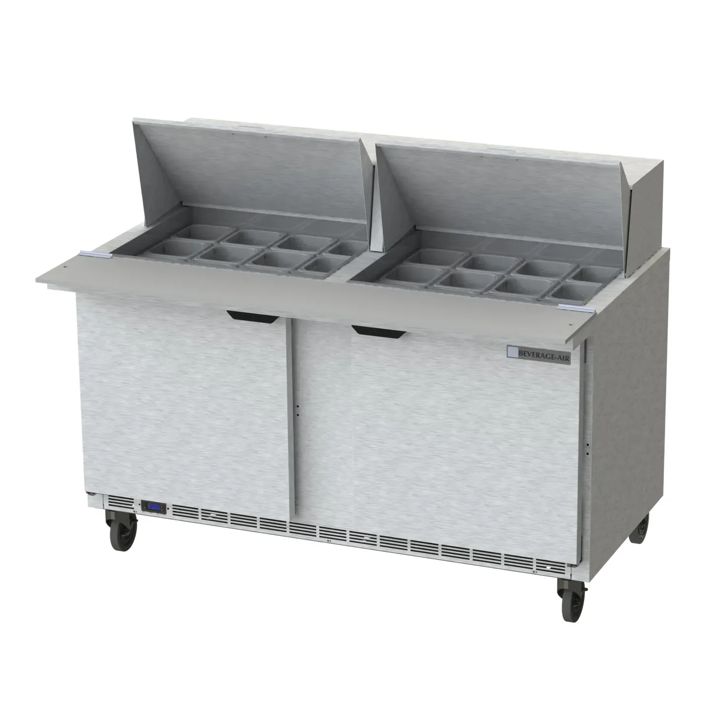 Enhance the heart of your restaurant with the Beverage Air SPE60HC-24M Refrigerated Counter, Mega Top Sandwich / Salad Unit. This two-section unit is designed to meet the demands of a busy commercial kitchen. With a spacious 60" width and a 16.02 cu. ft. capacity, it provides ample storage space for all your ingredients. The stainless steel top features an opening for 24 1/6 size pans, allowing you to easily access and organize your toppings and condiments. The unit also includes a convenient 10" cutting board for food preparation. With four shelves and two doors, you can keep your ingredients organized and easily accessible. The stainless steel exterior is not only durable but also adds a sleek and professional look to your kitchen. The rear-mounted self-contained refrigeration system ensures efficient cooling, while the R290 Hydrocarbon refrigerant is environmentally friendly. Made in the USA and certified by cULus and UL-Sanitation, this Beverage Air Refrigerated Counter is a reliable and high-quality addition to any commercial restaurant.