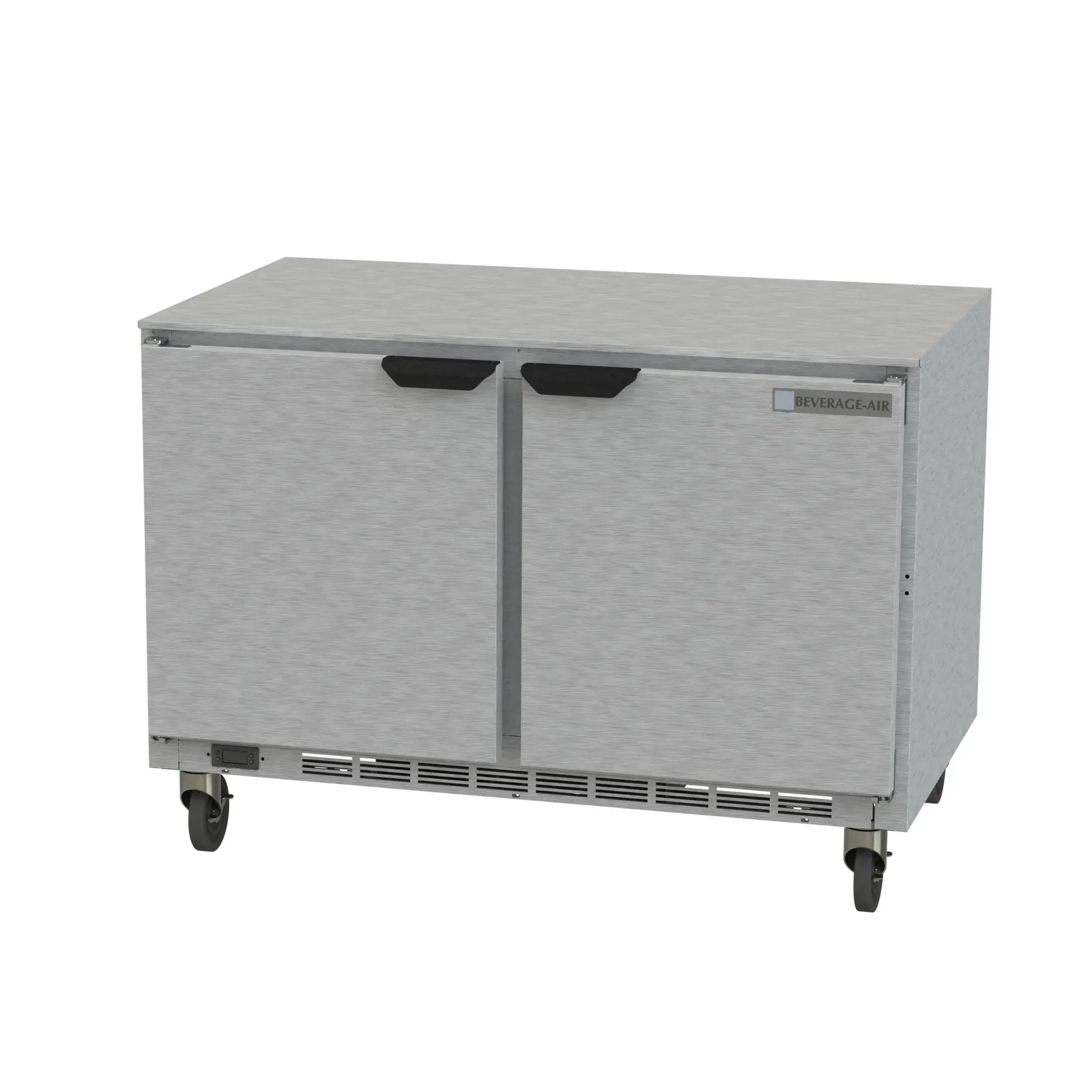 Revolutionize your cooking setup with the Beverage Air UCR48AHC Undercounter Reach-In Refrigerator. This two-section refrigerator is designed to meet the demands of a busy commercial restaurant kitchen. With a spacious 48"W and 11.82 cu. ft. capacity, it provides ample storage space for your ingredients and beverages. The stainless steel exterior and top not only give it a sleek and professional look but also make it durable and easy to clean. Inside, the aluminum interior and four shelves offer organized storage options. The rear-mounted self-contained refrigeration system ensures efficient cooling, while the use of R290 Hydrocarbon refrigerant makes it environmentally friendly. With a 1/6 HP compressor, this refrigerator is powerful enough to maintain consistent temperatures even in a high-volume kitchen. Certified by cULus and UL-Sanitation, this Made in USA refrigerator is a reliable and safe choice for your restaurant. Upgrade your kitchen with the Beverage Air UCR48AHC Undercounter Reach-In Refrigerator.