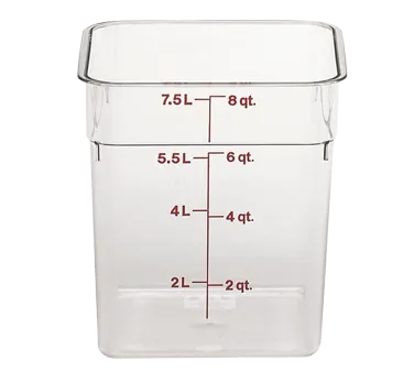 Innovate in the art of food service with Cambro's 8SFSCW135 Food/Beverage Storage Container. Designed for commercial restaurant use, this container is a game-changer in food storage. With a capacity of 8 quarts, it provides ample space to store and organize your ingredients, ensuring freshness and reducing waste. The clear Camwear square design allows for easy visibility, making it effortless to identify contents at a glance. Made by Cambro, a trusted name in food and beverage storage, this container is built to last. Whether you need to store prepped ingredients, leftovers, or bulk supplies, this container is up to the task. Invest in Cambro's 8SFSCW135 Food/Beverage Storage Container and elevate your restaurant's efficiency and organization.