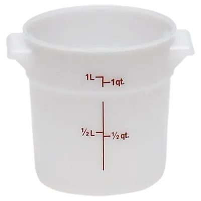 Introducing the Cambro RFS1148 Food/Beverage Storage Container, designed to maximize efficiency in service. This round 1 quart poly white container is a must-have for any commercial restaurant. The Cambro RFS1148 is made by Cambro, a trusted vendor in the food and beverage storage container category. Its durable construction ensures long-lasting performance, even in the busiest kitchen environments. The container is easy to clean and maintain, saving you valuable time and effort. Its compact size allows for easy stacking and storage, optimizing your kitchen space. Whether you need to store ingredients, leftovers, or prepped meals, this container is the perfect solution. Invest in the Cambro RFS1148 Food/Beverage Storage Container and experience the convenience and reliability it brings to your commercial restaurant.