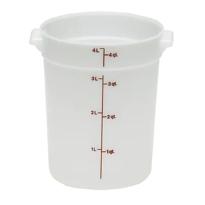 Invest in top-notch solutions with Cambro's RFS4148 Food/Beverage Storage Container. Designed specifically for commercial restaurant use, this round 4-quart poly white container is a must-have for any food establishment. The durable construction ensures long-lasting performance, even in the busiest kitchen environments. The tight-sealing lid prevents leaks and spills, keeping your food secure and reducing waste. This container is perfect for storing a variety of food and beverage items, from sauces and dressings to prepped ingredients and leftovers. Its compact size allows for easy stacking and efficient use of space. Trust Cambro's RFS4148 Food/Beverage Storage Container to meet your restaurant's storage needs and maintain the quality and freshness of your ingredients.