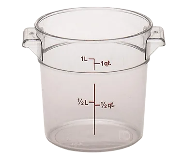 Bring precision to culinary tasks with the Cambro RFSCW1135 Food/Beverage Storage Container. Designed for commercial restaurant use, this container from Cambro is a must-have for any professional kitchen. With a capacity of 1 quart, it is perfect for storing and organizing ingredients, sauces, and leftovers. The clear Camwear construction allows for easy visibility of contents, ensuring quick and efficient inventory management. Made by Cambro, a trusted name in food and beverage storage, this container is built to withstand the rigors of a commercial kitchen. Its durable construction ensures long-lasting use, while the secure lid keeps contents fresh and protected. Whether you're a chef, caterer, or restaurant owner, the Cambro RFSCW1135 Food/Beverage Storage Container is an essential tool for maintaining organization and efficiency in your kitchen.