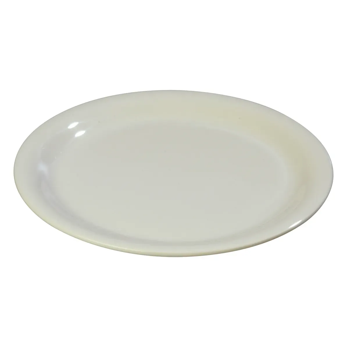 Set standards with the latest equipment. Introducing the Carlisle, 3300842, Plate, Plastic. This Sierrus Pie Plate is designed to meet the demands of a commercial restaurant setting. With a narrow rim and elevated foot design, it offers a sleek and modern look while providing practical benefits. Made from break-resistant melamine, this plate is dishwasher safe and resistant to drawing heat or cold from food, ensuring durability and longevity. Its bone color adds a touch of elegance to any table setting. As a BPA-free and NSF-certified product, it meets the highest standards of safety and quality. Upgrade your restaurant's tableware with the Carlisle, 3300842, Plate, Plastic and impress your customers with its style and functionality.