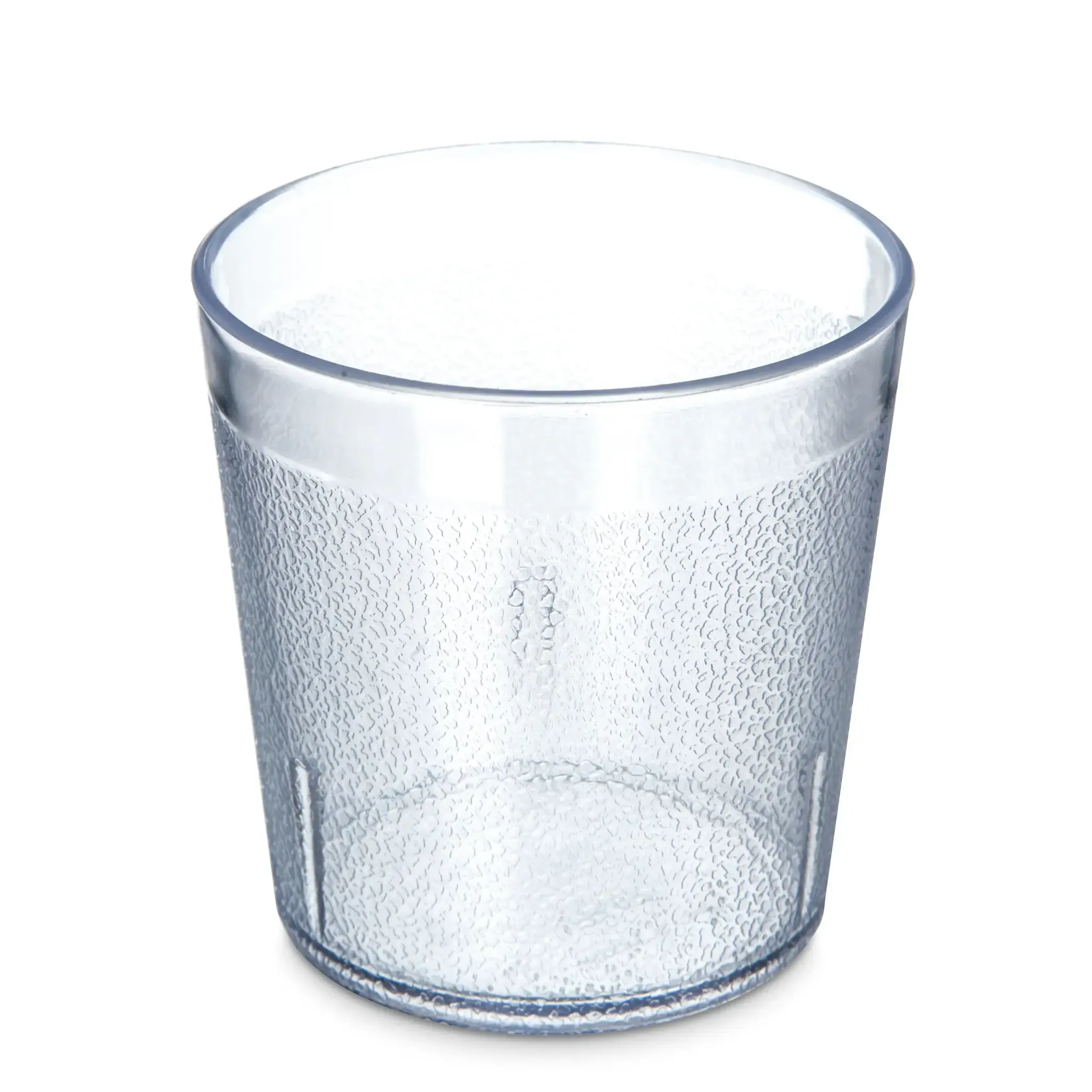Compete and excel with the latest innovations in commercial restaurant supplies with the Carlisle 552907 Plastic Tumbler. This stackable old-fashioned tumbler is designed to enhance your dining experience. With a capacity of 9 oz. (10.60 oz. flush fill), it is perfect for serving a variety of beverages. The tapered shape and textured exterior provide a comfortable grip, while the break-resistant construction ensures durability in a fast-paced restaurant environment. Made in the USA from BPA-free, recyclable SAN material, this clear tumbler is not only safe for your customers but also dishwasher safe for easy cleaning. This tumbler is ideal for high-volume establishments. Trust Carlisle, a reputable vendor in the industry, to deliver quality and reliability. Elevate your restaurant's beverage service with the Carlisle 552907 Plastic Tumbler.