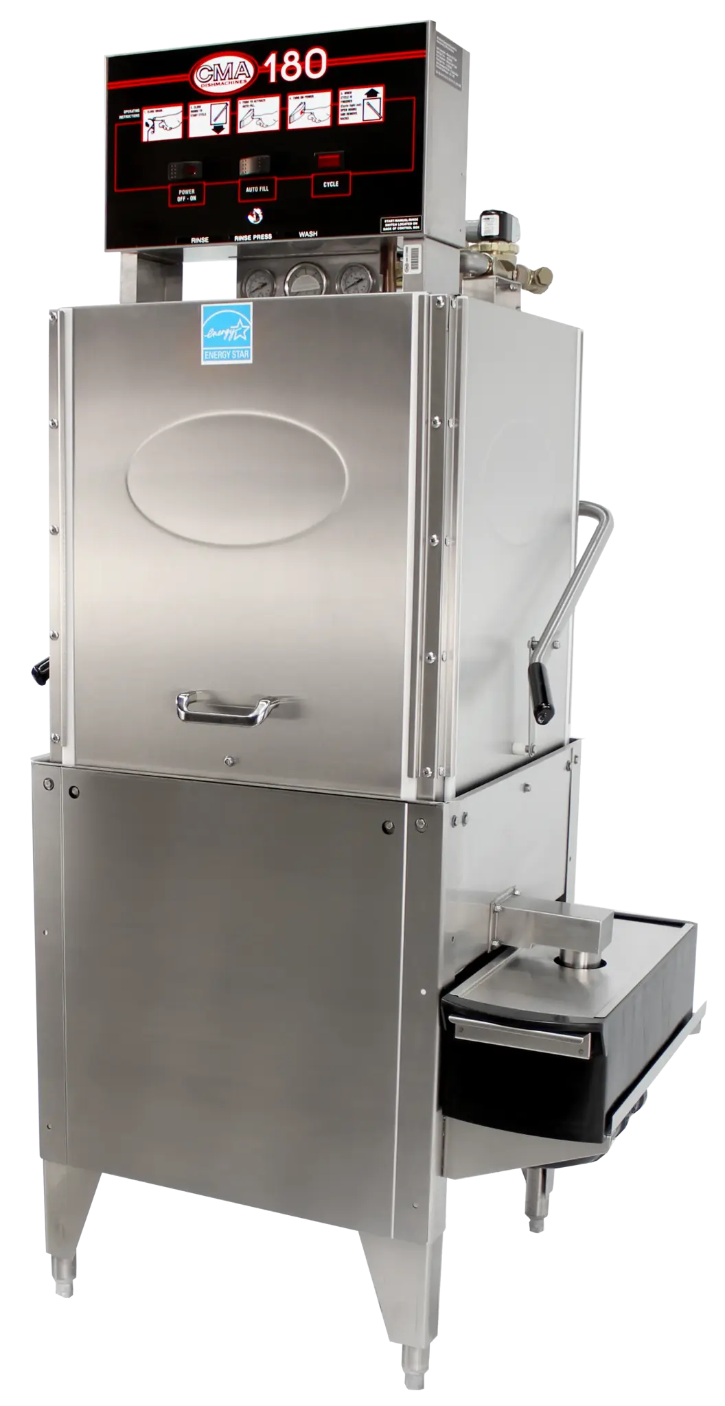 Enhance your commercial kitchen with the CMA Dishmachines, 180S, Dishwasher, Door Type. This high-quality dishwasher is designed to meet the demands of a busy restaurant environment. With its straight-thru design and top-mounted control box, it offers convenience and efficiency. The dishwasher has a high temperature sanitizing feature, ensuring that your dishes are thoroughly cleaned and sanitized. It does not require a booster, as it can operate with water supplied at a minimum temperature of 180 degrees. The external Poly Pro scrap accumulator helps to keep the wash water clean, while the stainless steel construction ensures durability and easy cleaning. The dishwasher also includes one open and one peg rack, providing flexibility for different types of dishes. With a wash capacity of 60 racks per hour and an ENERGY STAR certification, this dishwasher is a reliable and energy-efficient choice for any commercial restaurant. Trust CMA Dishmachines to deliver exceptional performance and reliability for your kitchen.
