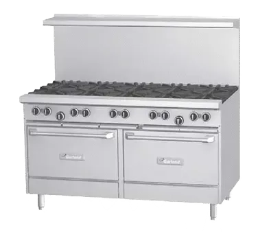 Effortless Kitchen Efficiency meets its match with the Garland/US Range G60-10RR. This G Starfire Pro Series Restaurant Range is designed specifically for commercial restaurant use, offering exceptional performance and durability. With its 60" size and (10) 33000 BTU open burners, this range provides ample cooking space and precise heat control for even the busiest kitchens. The cast iron top and ring grates ensure even heat distribution and easy cleanup. The two standard ovens feature 3 position rack guides and come with an oven rack each, allowing for versatile cooking options. Made with a stainless steel front, sides, plate rail, 2-piece back guard, and shelf, this range is built to withstand the demands of a commercial kitchen. The 6" stainless steel legs with adjustable feet provide stability and flexibility. With a powerful 406000 BTU output, CSA Flame, CSA Star, cCSAus, and NSF certifications, this Garland/US Range is a reliable and efficient choice for any commercial restaurant.