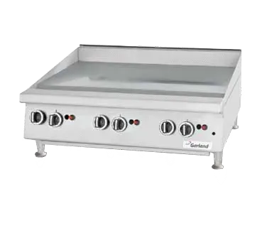Enhance Your Culinary Expertise with the Garland/US Range GTGG48-GT48M Gas Countertop Griddle. This heavy-duty griddle is designed for commercial restaurant use, offering a spacious 47-1/4" W x 23" D cooking surface. The 1" thick smooth steel griddle plate ensures even heat distribution and excellent heat retention, allowing you to cook a variety of dishes to perfection. With snap action thermostatic controls and piezo pilot igniters, you have precise control over the cooking temperature. The 4" deep front grease trough makes cleaning a breeze, while the stainless steel front, sides, and back ensure durability and easy maintenance. The griddle also features 4" adjustable feet for stability and convenience. With a powerful 112000 BTU output, this NSF and CSA certified griddle delivers exceptional performance and reliability, making it an essential addition to any commercial kitchen.