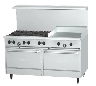 Optimize Your Foodservice Setup with the Garland/US Range X60-6G24RR Gas Restaurant Range. This top-of-the-line range is designed to meet the demands of a busy commercial kitchen. With a spacious 60" width and a 24" griddle featuring a 5/8" thick steel plate, this range provides ample cooking space for a variety of dishes. The six 30,000 BTU open burners, complete with cast iron top and ring grates, deliver powerful and even heat distribution for precise cooking. The two standard ovens, equipped with 2 position rack guides and oven racks, offer versatility and efficiency. Made with stainless steel front, sides, plate rail, backguard, and high shelf, this range is built to withstand the rigors of a professional kitchen. With 6" steel core legs for stability and a total BTU of 286,000, this NSF and CSA certified range is a reliable and efficient choice for any commercial restaurant.