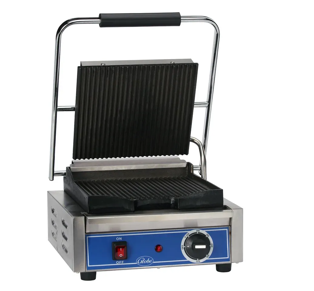 Realize kitchen dreams with the Globe GPG10 Sandwich / Panini Grill. This countertop electric grill is a must-have for any commercial restaurant. Its cast iron grooved plates provide even heat distribution and create those perfect grill marks on your sandwiches and paninis. With a 10" x 10" surface size, you can easily cook multiple sandwiches at once, increasing efficiency in your kitchen. The temperature control goes up to 570F, allowing you to achieve the ideal level of crispiness and meltiness. The spring hinge with adjustable tension ensures that your sandwiches are pressed evenly, resulting in a deliciously compact and flavorful bite. The stainless steel removable catch tray makes cleaning a breeze, while the non-skid rubber feet keep the grill securely in place during use. With its durable stainless steel construction, this grill is built to withstand the demands of a busy commercial kitchen. Trust Globe to deliver high-quality equipment that will elevate your sandwich game.