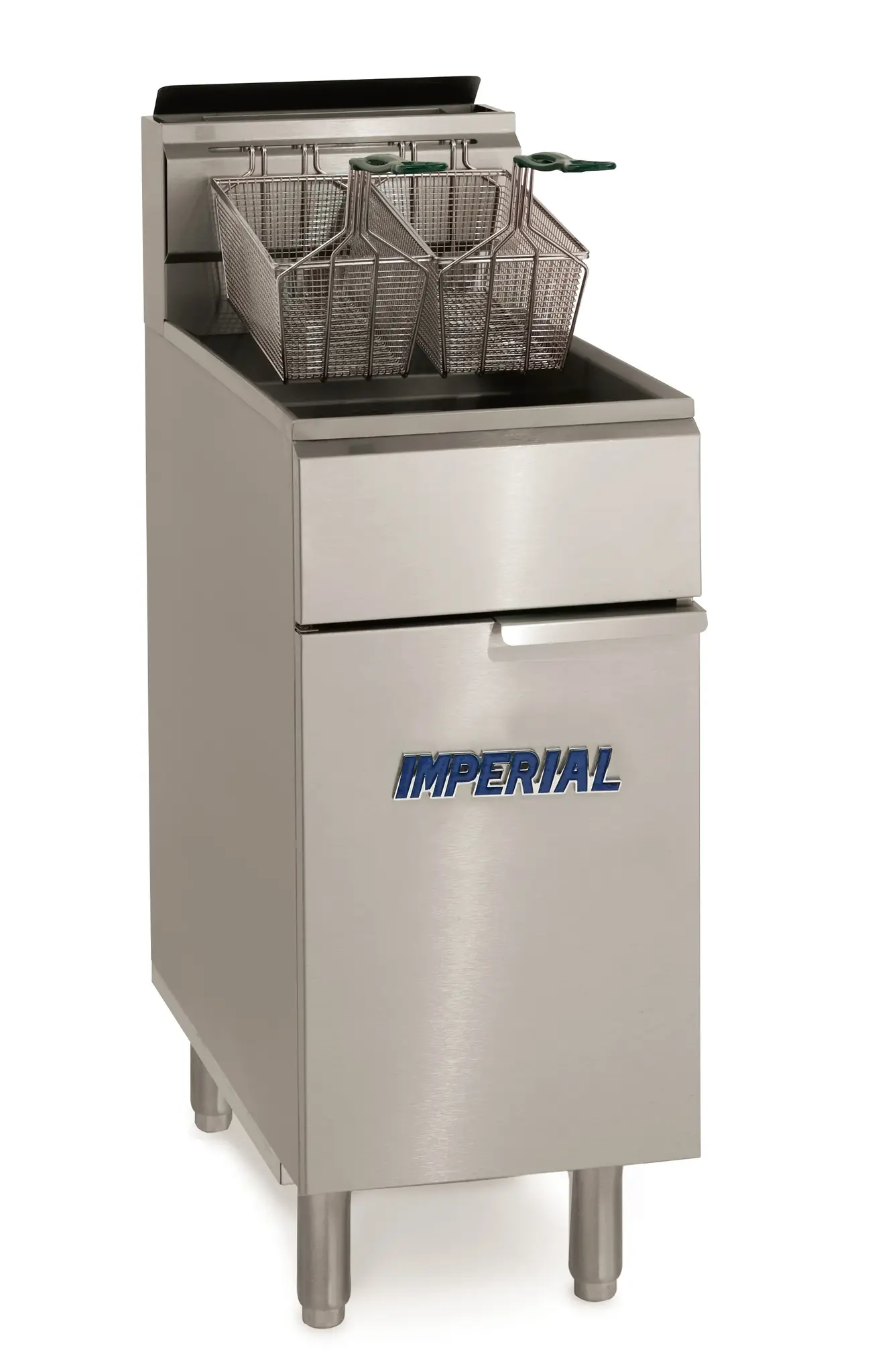 Imperial Fryer - 40lb full size stand alone fryer. Tubes are constructed of heavy gauge metal with a built-in deflector system. Snap Action Thermostat heats oil quickly producing a better tasting product with less oil absorption. Includes mesh crumb tray and two baskets
