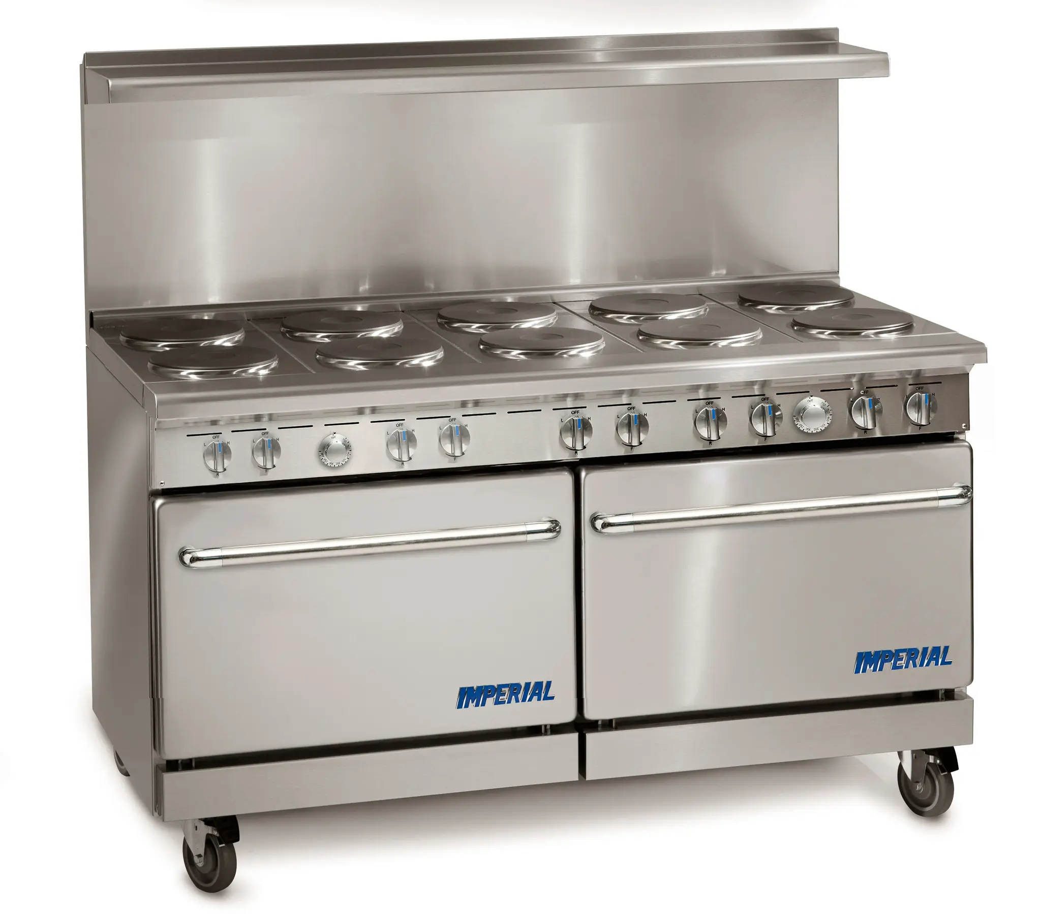 Empower your kitchen staff with the Imperial IR-10-E Range, a top-of-the-line electric restaurant range designed to enhance efficiency and productivity in your commercial kitchen. This 60" range features 10 round elements and a solid top, providing ample cooking space for your culinary creations. The two standard ovens come with a chrome rack each, allowing you to bake multiple dishes simultaneously. With infinite heat controls, you have precise control over the cooking temperature, ensuring consistent and delicious results every time. The porcelain oven interior is not only easy to clean but also provides excellent heat retention for efficient cooking. Made with a stainless steel front, sides, backguard, landing ledge, and kick plate, this range is built to withstand the demands of a busy restaurant kitchen. The adjustable feet and 6" legs provide stability and flexibility in installation. Trust Imperial to deliver exceptional quality and performance for your restaurant's cooking needs.