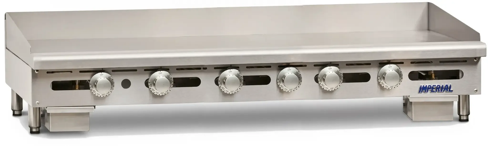 Imperial Thermostatic Griddle . 72" Wide. Standard 1" thick griddle plate. One burner 12" apart. Thermostat maintains heat evenly through the width of the unit
