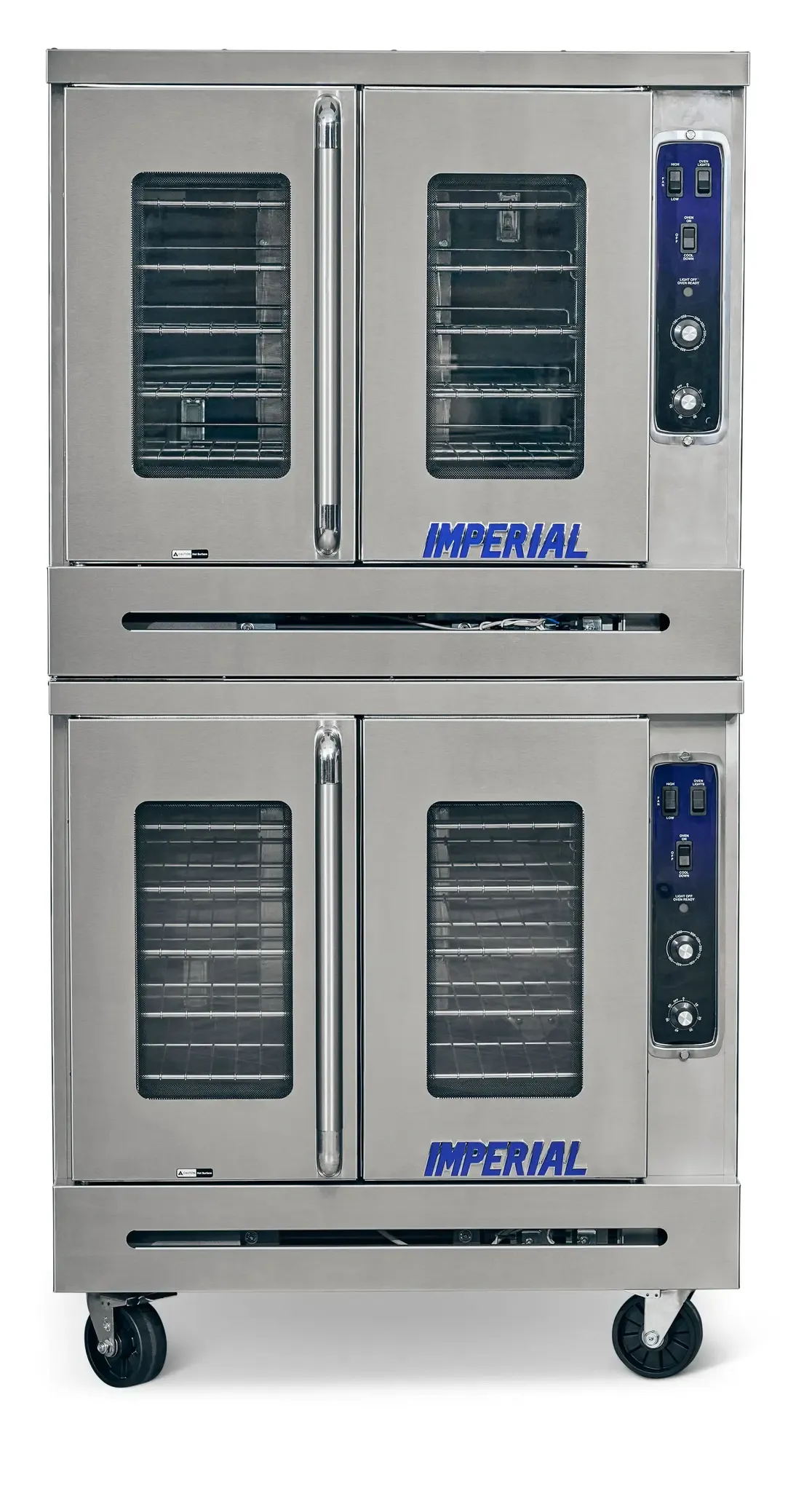 Imperial Double Stacked convection oven. Oven comes with (5) chrome wire racks and 10 channels. with 50/50 swing doors to open 130 degrees. Two interior lights and Digital Electronic Controls