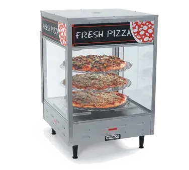 Introducing the Nemco 6451 Display Case, Hot Food, Countertop a brilliant addition to any commercial restaurant. Crafted with stainless steel construction and a tempered glass case, this pizza merchandiser is designed to showcase your delicious creations while keeping them at the perfect temperature. The rotating, three-tier design features 18" diameter racks, allowing for maximum visibility and easy access. With an illuminated interior and thermostat control up to 200°F, your food will always look and taste its best. The included signage adds a professional touch, while the water reservoir ensures your dishes stay moist and flavorful. Powered by 1480 watts and 12.4 amps, this NSF-certified display case is built to handle the demands of a busy kitchen. Elevate your restaurant's presentation and attract customers with the Nemco 6451 Display Case, Hot Food, Countertop.