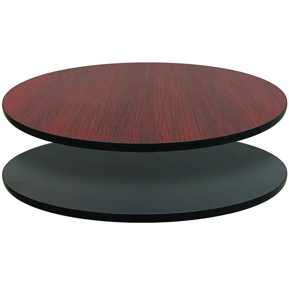 Elevate Guests' Enjoyment with Oak Street's MB30R Table Top. Designed specifically for commercial restaurant use, this laminate table top is a perfect addition to any dining establishment. The 30" round top is made of industrial-grade particle board with a 1" thickness, ensuring durability and longevity. The melamine surface is not only easy to clean but also CARB-Compliant Phase 2 for California, making it environmentally friendly. The extruded black rubber T-mold edge adds a sleek and professional touch to the table top. With its reversible design, you can choose between a mahogany or black finish to suit your restaurant's aesthetic. Oak Street's MB30R Table Top is quick to ship and comes packed with care by Oak Street. Enhance your restaurant's ambiance and impress your guests with this high-quality table top.