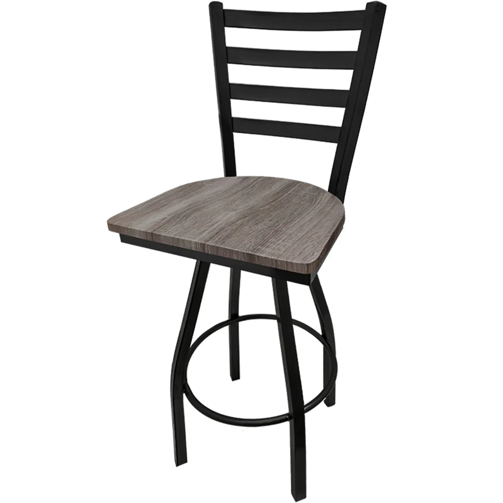 Enhance Vision Elegant Decor with the Oak Street SL2301S-BW Bar Stool. Designed for commercial restaurant use, this swivel bar stool combines style and functionality to elevate any dining space. The ladderback design and barnwood wood seat exude rustic charm, while the black swivel frame adds a modern touch. The premium black powder coat wrinkle finish ensures durability and a sleek look. Crafted with a 1.2mm steel frame and 1-1/4" tubing, this bar stool is built to withstand heavy use. The 4-degree slant swivel attached to the frame allows for easy movement, while the non-marring glides protect your floors. With simple assembly required, this bar stool is a convenient choice for busy restaurant owners. Trust Oak Street, a reputable vendor in the industry, to provide you with quality and style.
