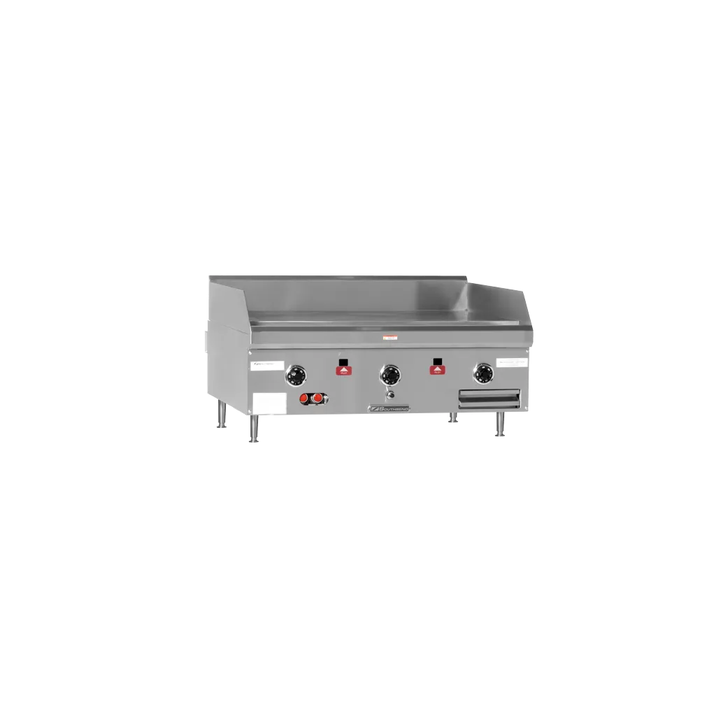 The Counterline Heavy Duty Thermostatic Gas Griddle is engineered for precision, power, and performance in high-demand commercial kitchens. With a 30,000 BTU burner per 12" section and a 1" thick polished rolled steel plate, this griddle delivers rapid, uniform heat across the surface—thanks to the exclusive "NO COLD" Zone technology. The "Insta-on" thermostatic controls allow for accurate temperature settings from 200F to 550F, supported by an embedded load-sensing thermostat for consistent cooking performance across shifts.