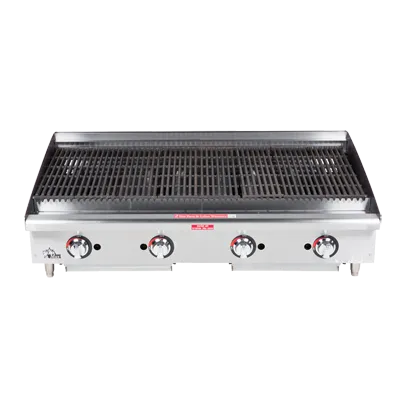 Achieve culinary excellence with the Star, 6148RCBF, Charbroiler, Gas, Countertop. This high-quality charbroiler from Star is designed to meet the demands of commercial restaurant kitchens. With its heavy stainless steel radiants and cast iron broiling grates, this charbroiler ensures even heat distribution and excellent cooking results. The 48" wide cooking surface provides ample space for grilling a variety of meats and vegetables, while the adjustable manual controls every 12" allow for precise temperature control. The welded steel frame with a stainless steel top and front, along with aluminized steel sides, ensures durability and easy cleaning. The stainless steel water pan, splash guard, and grease trough help to maintain a clean and safe cooking environment. With a powerful 160,000 BTU output, this charbroiler delivers exceptional performance. Whether you're grilling steaks, burgers, or vegetables, the Star, 6148RCBF, Charbroiler, Gas, Countertop is the perfect addition to any commercial restaurant kitchen.