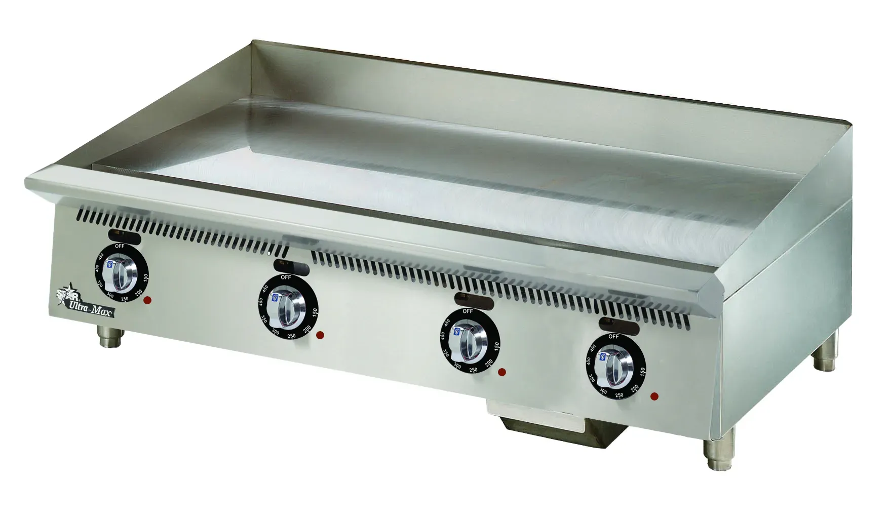 Ultra-Max® gas griddles are our highest performance griddle designed for high output and long life. For breakfast, lunch or dinner, the Ultra-Max griddles out-perform the competition. Ultra-Max® griddles features a 1” thick polished steel griddle plate, 30,000 BTU burners every 12″, and are available in 24”, 36”, 48”, 60″, and 72″ widths. Chrome plates are optional.