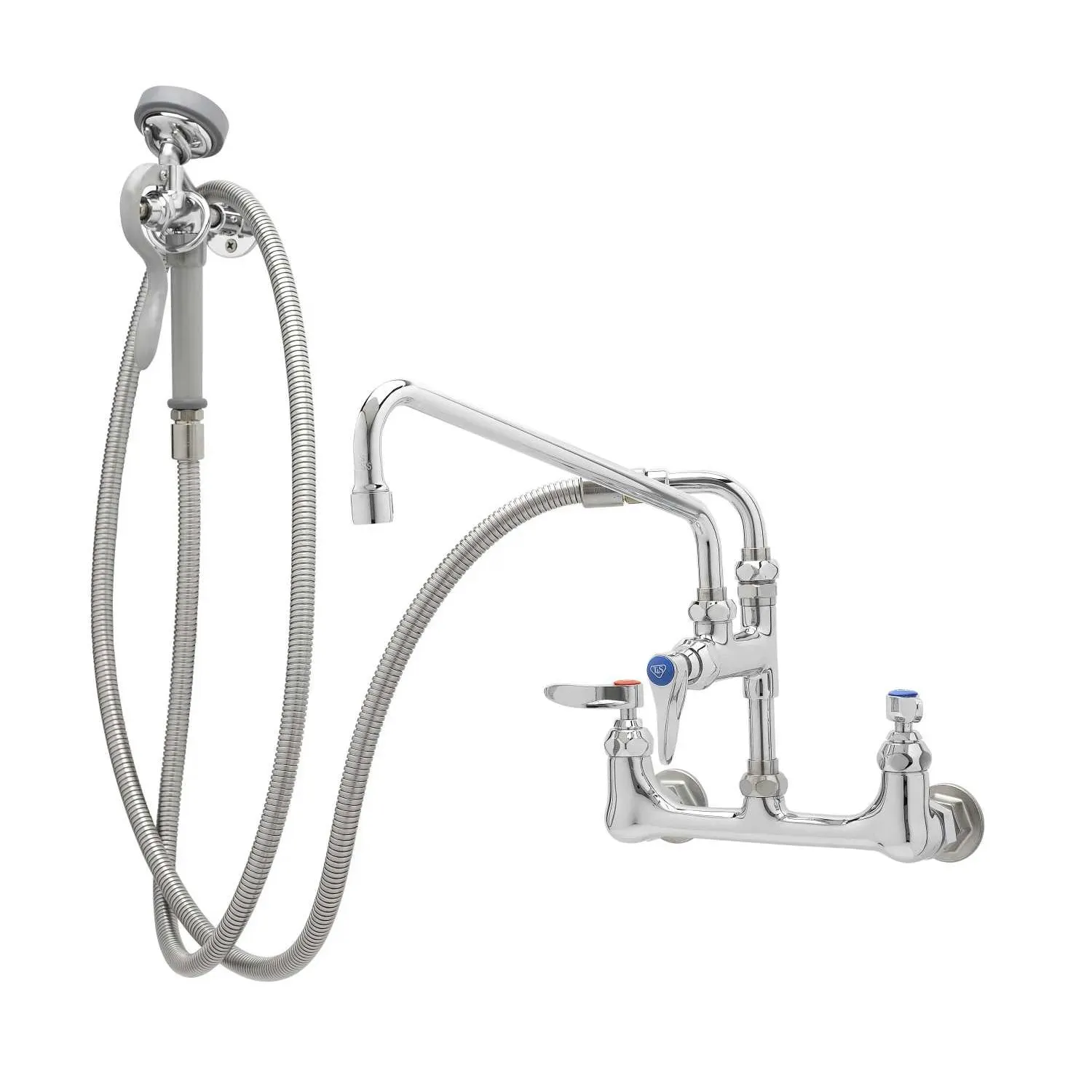 Facilitate Equipment Reliability with the T&S Brass B-0175 Faucet, with Spray Hose. This versatile spray assembly is designed specifically for commercial restaurant use, ensuring durability and efficiency in any kitchen setting. The 8" wall mount base and 12" add-on faucet provide convenient access to water, while the 104" hose and angled spray valve offer flexibility and ease of use. With a polished chrome plated brass body, this faucet is not only stylish but also resistant to corrosion and wear, guaranteeing long-lasting performance. The 12" swing nozzle with a stream regulator outlet allows for precise control of water flow, making it ideal for rinsing dishes, cleaning produce, and filling large pots. Trust in T&S Brass, a reputable vendor known for their high-quality products, to enhance the reliability and functionality of your restaurant equipment.