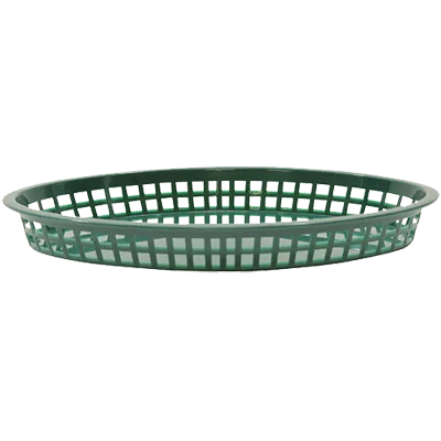 Elevate culinary experiences with TableCraft Products' Fast Food Basket, model number 1086FG. This oval-shaped Texas Platter Basket is designed to enhance the presentation of your delicious dishes. Measuring 12-3/4" x 9-1/2" x 1-1/2", it offers ample space for serving a variety of meals. Crafted from heat-resistant polypropylene, this forest green basket can withstand temperatures up to 150F/65C, making it perfect for use with heat lamps, dishwashers, and microwaves. Its durability ensures long-lasting performance, while its Made in USA label guarantees authenticity and quality. Whether you're serving burgers, sandwiches, or appetizers, this Fast Food Basket adds a touch of elegance to any dining experience. Trust TableCraft Products for all your restaurant needs.