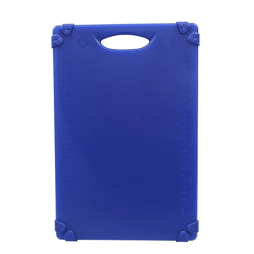 Equip for culinary success with the TableCraft Products CBG1520ABL Cutting Board. Designed specifically for commercial restaurant use, this plastic cutting board is a must-have tool in any professional kitchen. With its generous size of 15" x 20" and 1/2" thickness, it provides ample space for slicing, dicing, and chopping ingredients. The integrated handle allows for easy transportation and storage, while the anti-slip grips ensure stability during use. Made from heat, chemical, and warp-resistant materials, this cutting board is built to withstand the demands of a busy kitchen. It is also dishwasher safe, making cleanup a breeze. The vibrant blue color adds a pop of personality to your workspace. NSF certified, this cutting board meets the highest standards of safety and sanitation. Invest in the TableCraft Products CBG1520ABL Cutting Board and elevate your culinary creations to new heights.