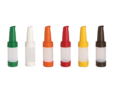 Premium tools for a successful setup with TableCraft Products, N32VA, Drink Bar Mix Pourer Complete Unit. This versatile and essential tool is designed to enhance efficiency and accuracy in commercial restaurant settings. The Cash & Carry PourMaster Complete Unit includes a 1-quart container with assorted color-coded caps, ensuring easy identification and organization. With two caps of each color - brown, green, red, orange, white, and yellow - you can effortlessly differentiate between various ingredients or mixtures. Made from dishwasher-safe polyethylene, this unit is not only durable but also BPA-free, guaranteeing the safety of your customers. The PourMaster V-Neck Top and StorMaster cap provide a secure and spill-free pouring experience. NSF certified, this unit meets the highest standards of quality and hygiene. Whether you're a barista, mixologist, or chef, the TableCraft Products Drink Bar Mix Pourer Complete Unit is a must-have tool for precise and efficient beverage preparation.