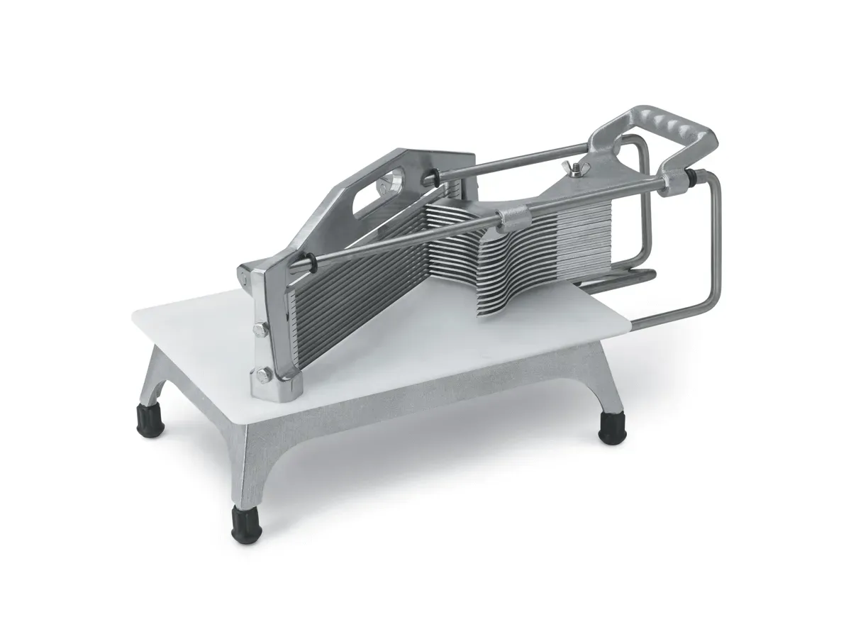 Easily prepare perfect tomato slices with the Vollrath® 3/16-inch-slice Tomato Pro tomato slicer. This sturdy slicer accurately cuts tomatoes, strawberries, oranges and more with one stroke, without causing bruising or waste. The unique design of this unit allows tomatoes to be sliced without prescoring, and the scalloped 3/16-inch slicing blade creates consistent slices. A positive-stop arm prevents the unit from moving during use, and the base of the unit is made out of high-density polyethylene material that resists corrosion from tomato acids and other harsh foods. This tomato slicer is built to last and is ideal for any prep kitchen.