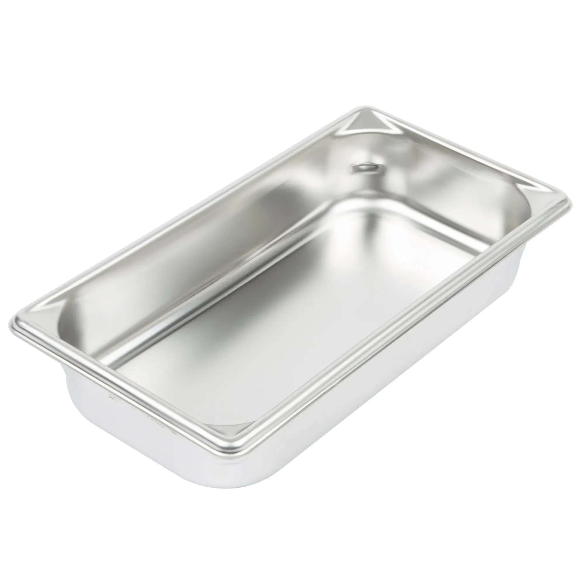 This durable 22-gauge 300-Series stainless steel pan features smooth curves and a bright finish for an elegant presentation. Resistant to dents and dings, this pan has rounded, diagonally tapered corners that are up to 300 percent stronger compared to traditional corners, and the design makes it easy to pour and scoop out food. The pan also features flat edges with higher rims to prevent loss of steam, making it notably more efficient than weaker pans with bent edges. Antijam stacking lugs enable easy separation and lifting of the pan.