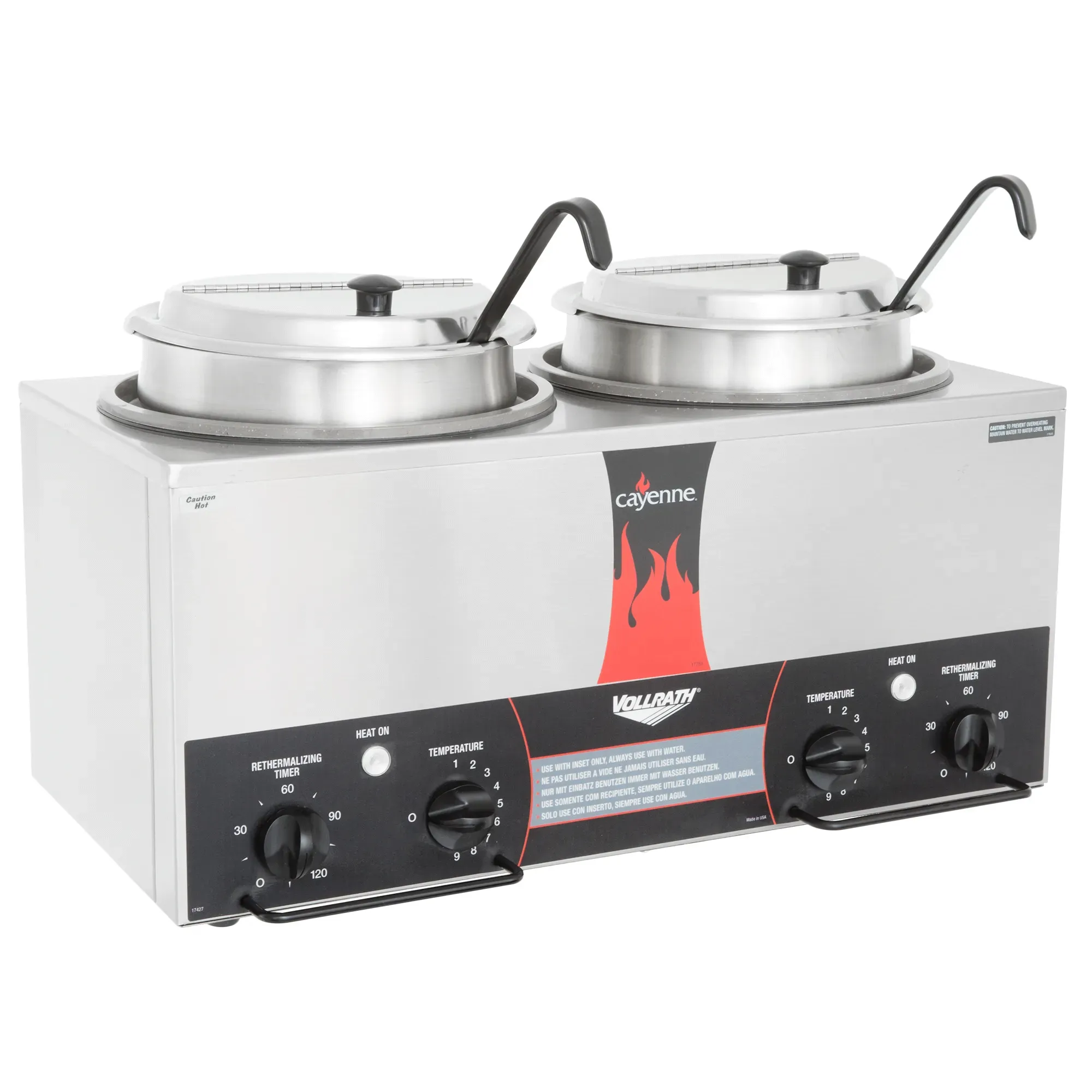 The Vollrath® Cayenne model TW-27R rethermalizer is durable, energy-efficient, and easy to use. With the direct-contact heating system, this rethermalizer uses up to 25 percent less energy and quickly heats your food. With the two insets, two hinged Kool-Touch® covers, and two Kool-Touch ladles that come in this package, you have everything you need to operate this rethermalizer. Each well has an independent thermostatic control, allowing you to heat two different products at once, as well as a rethermalizing timer that stops warming when the timer ends. Once the timer is done, simply set your desired holding temperature to maintain heat. Knob guards prevent accidental adjustments, and the durable stainless steel exterior gives this unit a clean look.