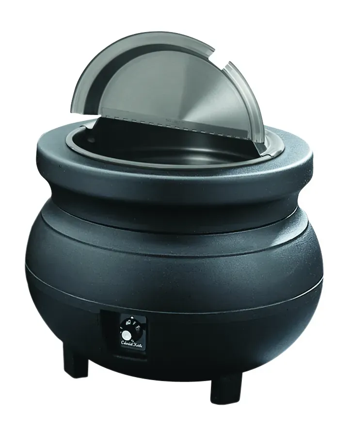 The Vollrath® 7-quart Cayenne 1776 & 1777 Colonial Kettle rethermalizer is ideal for soup, stew, chili and more. This 1000-watt rethermalizer is made of durable cast aluminum and coated in black epoxy to give it a versatile, attractive appearance. The recessed controls prevent accidental temperature adjustments, and the hinged lid seals heat inside while simultaneously allowing easy access. This kettle comes with display cards and clips to properly advertise its contents.