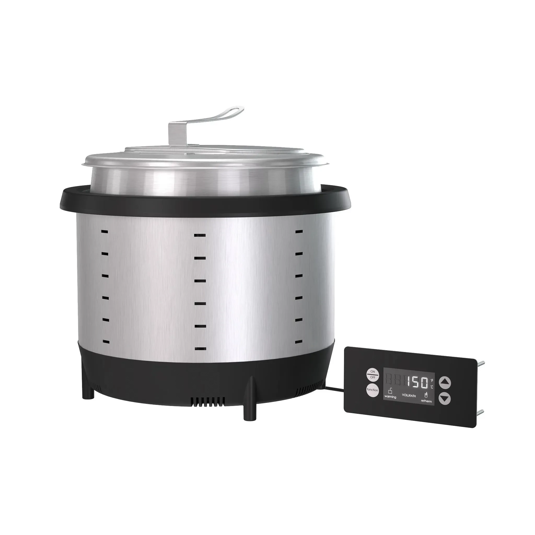 Reliable and easy to use, the Mirage drop-in induction rethermalizer by Vollrath fits seamlessly into your lineup and heats your soup, chili, mac and cheese or stew to perfect serving temperatures. Powerful induction technology does not require water, ensuring faster heating times, better temperature control and simpler operation. Three sensors monitor food temperatures on the inset, and an indicator light notifies you when the contents need to be stirred, helping to distribute heat evenly and prevent burning. And the unit won’t provide heat until an induction-ready inset is placed inside to reduce energy waste. The remote control features four convenient presets or precise temperature settings in °F or °C, depending on your preference, and a locking function prevents accidental temperature changes. This exceptional product comes with a Vollrath induction-ready inset and top contemporary design inset cover, providing everything you need for operation.
