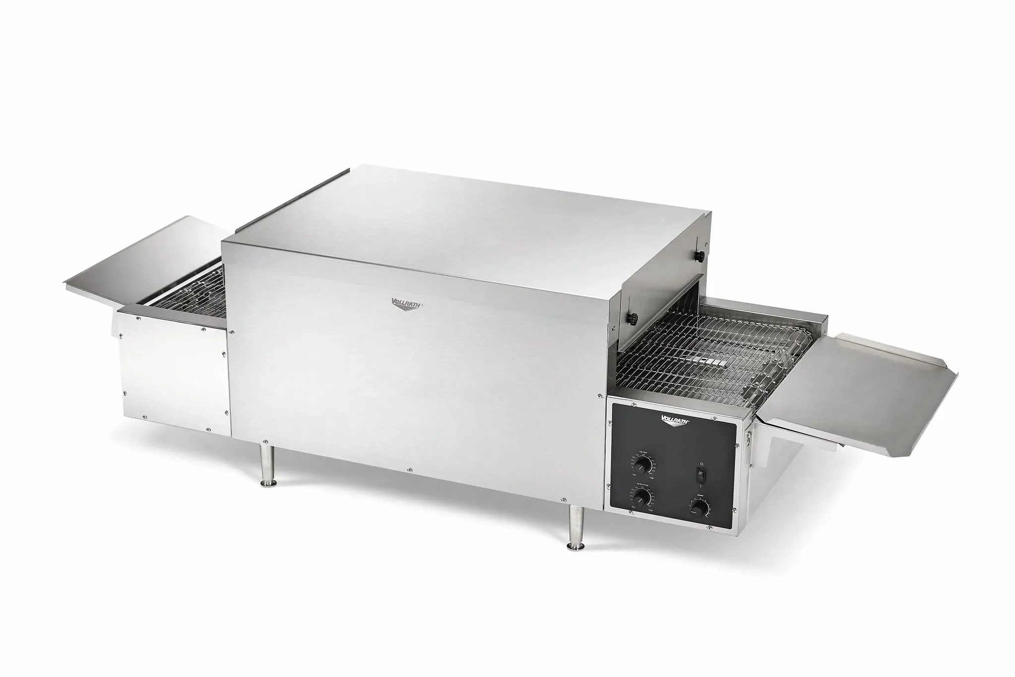 The Vollrath® 18-inch conveyor pizza oven is ideal for fresh or par-baked pizzas and flatbreads. This 18-inch-wide conveyor fits a variety of foods and moves from left to right. The adjustable 1½- to 4-inch product opening accommodates foods of varying heights. Variable-speed controls allow quick adjustments during baking if needed. The energy-efficient quartz heating elements are fast and powerful, while individual top and bottom thermostatic controls ensure desired results. The ventless design allows flexibility in placement and lowers installation costs. Loading and receiving trays make it easy to keep products moving in and out, speeding up your service. A maintenance-free drive system simplifies operation and servicing, and the durable stainless and aluminized steel exterior is built to last.