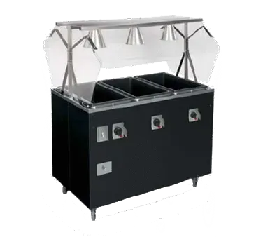 Introducing the Vollrath T387072 Serving Counter, Hot Food, Electric - the perfect addition to drive restaurant profitability. This affordable portable hot food station deluxe is designed to meet the demands of a commercial restaurant setting. With its three wells and buffet-style breath guard, it provides ample space for serving a variety of hot dishes. The individual manual dial controls for each 600-800 watts thermoset sealed well ensure precise temperature control without the need for spillage pans. The enclosed base and manifold drain make cleaning and maintenance a breeze. Made in the USA with a black vinyl-clad 20 gauge carbon steel base, this serving counter is built to last. The four 4" swivel casters, two of which are braked, allow for easy mobility and stability. Trust Vollrath, a reputable vendor in the industry, and invest in this electric serving counter to enhance your restaurant's efficiency and profitability.