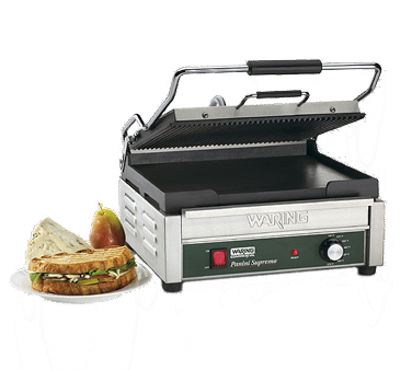 Introducing the Waring WDG250 Sandwich / Panini Grill, a must-have for any commercial restaurant looking to drive profitability. This dual surface panini grill is designed to deliver exceptional results with its 14-1/2" x 11" cooking surface. The hinged auto-balancing top plate, equipped with heat resistant handles, ensures even cooking and perfect grill marks every time. With a ribbed top and flat bottom grill, this versatile appliance allows you to create a variety of delicious sandwiches and paninis. The adjustable thermostats, reaching up to 570F (300C), give you precise control over the cooking temperature, while the indicator lights make monitoring a breeze. Made with a brushed stainless steel body and a removable drip tray, this grill is not only durable but also easy to clean. Trust Waring, a reputable vendor in the industry, and elevate your restaurant's sandwich game with the Waring WDG250 Sandwich / Panini Grill.