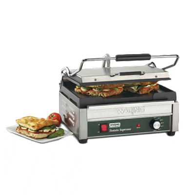 Elevate your culinary experience with the Waring WFG250 Sandwich/Panini Grill. This electric grill is perfect for commercial restaurant use, offering a large 14-1/2" x 11" cooking surface to accommodate multiple sandwiches or paninis at once. The hinged auto-balancing top plate with heat resistant handles ensures even cooking and easy operation. The flat cast iron plates provide excellent heat distribution and retention, resulting in perfectly grilled sandwiches every time. With adjustable thermostats reaching up to 570 F (300 C), you have full control over the cooking temperature to achieve the desired level of crispiness. The indicator lights let you know when the grill is ready for use, and the brushed stainless steel body and removable drip tray make cleaning a breeze. Trust the Waring WFG250 Sandwich/Panini Grill to deliver consistent, high-quality results for your commercial kitchen.