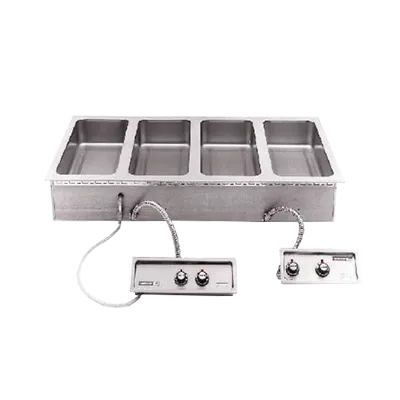 Fuel your restaurant's success with the Wells MOD-400TDM Hot Food Well Unit. This top-mount, built-in electric food warmer is designed to meet the demands of a busy commercial kitchen. With four 12" x 20" openings and manifold drains with one valve, this unit allows for efficient wet or dry operation. The thermostatic controls ensure precise temperature regulation, while the stainless steel interior and insulated aluminum steel housing provide durability and heat retention. Whether you need to keep soups, sauces, or other hot dishes at the perfect serving temperature, this food well unit has you covered. It is available in both 208/240v/60/1-ph or 3-ph options, with 1240/1650 watts per well. Field wiring allows for easy installation and conversion. Trust Wells, a reputable vendor in the industry, to deliver a high-quality product that will enhance your restaurant's efficiency and productivity.
