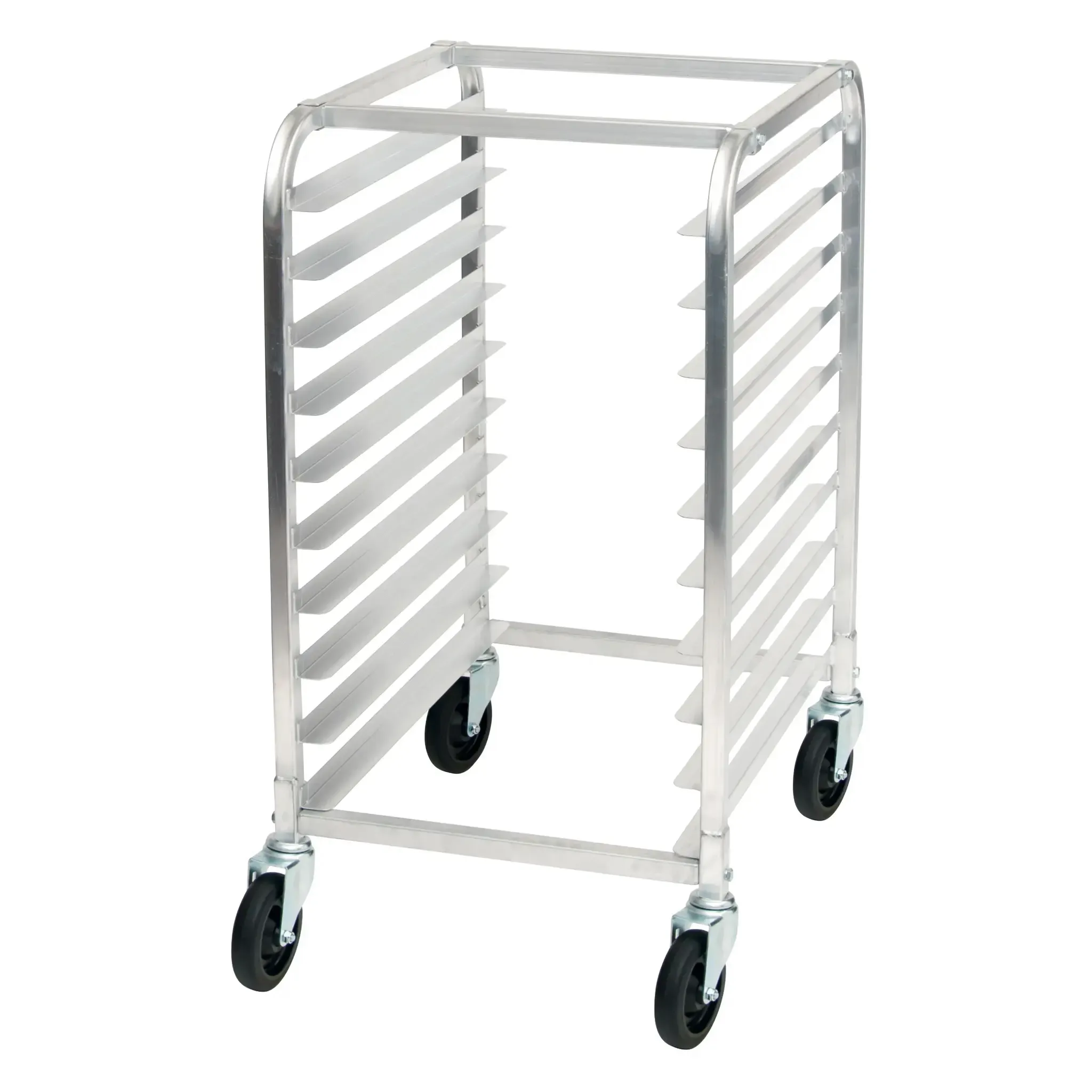 Make every meal memorable with the Winco Sheet Pan Rack. Designed to meet the rigorous demands of a bustling restaurant kitchen, this mobile rack offers unparalleled convenience and efficiency. With a capacity to hold 10 full-size 18 x 26 sheet pans or 20 half-size 18 x 13 sheet pans, it ensures you have ample space to organize and transport your culinary creations. Crafted from durable aluminum, the Winco Sheet Pan Rack boasts a robust 400 lb. capacity, making it ideal for heavy-duty use. The 3-inch runner spacing provides optimal airflow and stability, ensuring your dishes remain secure and evenly cooked. Whether you're baking, cooling, or storing, this rack is a versatile addition to your kitchen arsenal. Equipped with smooth-rolling casters, the Winco Sheet Pan Rack offers effortless mobility, allowing you to move it seamlessly across your kitchen. Its knock-down (KD) design ensures easy assembly and disassembly, making it convenient for storage and transport. Plus, with NSF certification, you can trust that this rack meets the highest standards of safety and sanitation. Elevate your kitchen's efficiency and organization with the Winco Sheet Pan Rack. Its sturdy construction, generous capacity, and user-friendly features make it an indispensable tool for any professional kitchen. Invest in quality and reliability with Winco, and watch your culinary operations run smoother than ever.