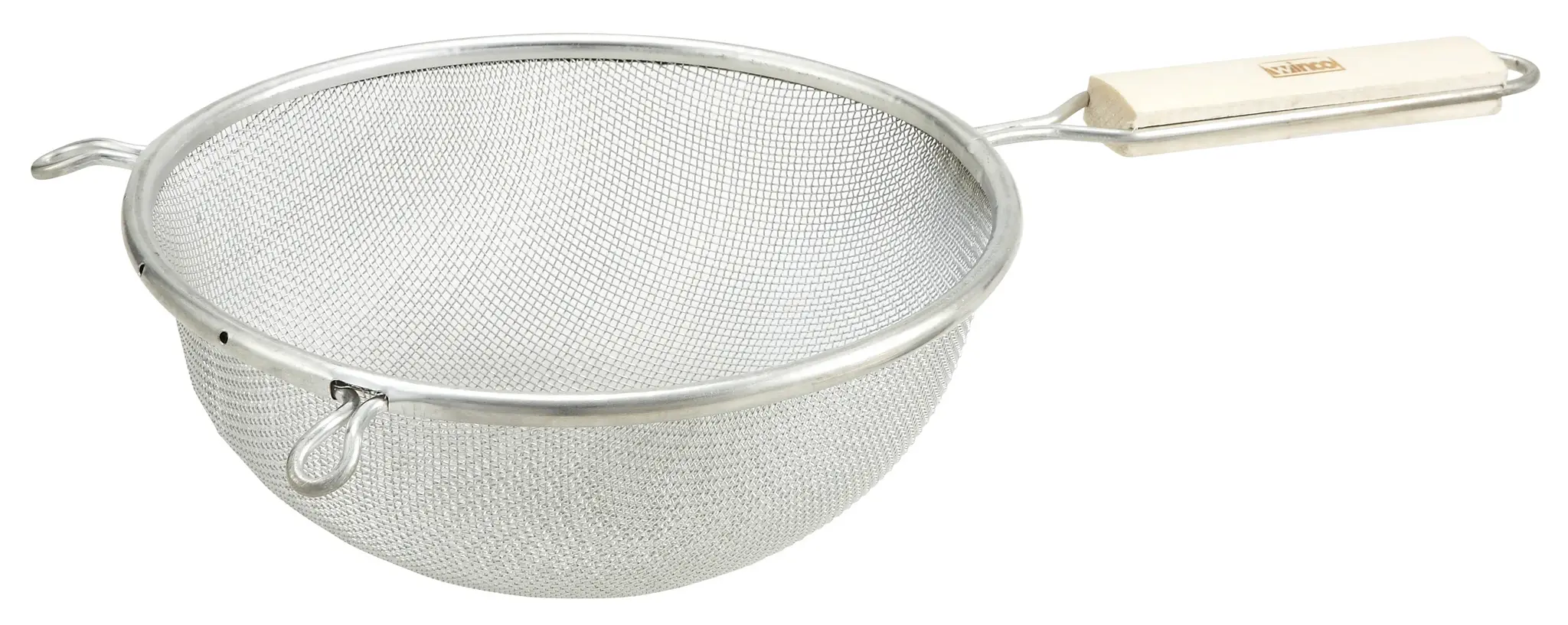 The Winco Strainer MST-6S boasts a medium tinned mesh that provides the ideal balance between durability and effective straining. The single round mesh design ensures that even the finest particles are filtered out, delivering a smooth and consistent texture to your culinary creations. The 12-12 inch overall length (O.A.L.) handle is crafted from wood, offering a comfortable and secure grip, which is essential for maintaining control and reducing hand fatigue during extended use.