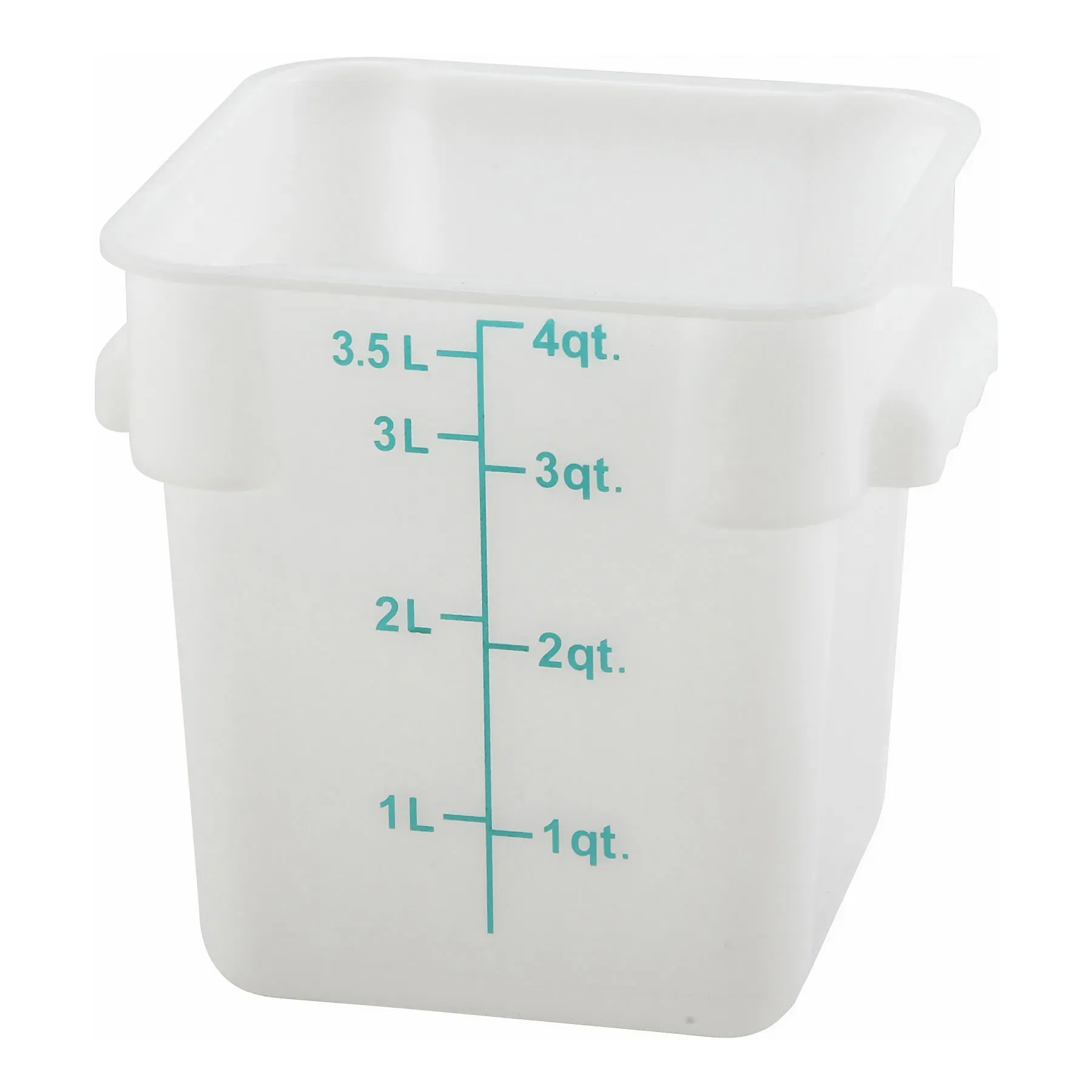 Simplify daily tasks with the Winco 4qt Square Storage Container White PP. Designed to meet the rigorous demands of a bustling restaurant kitchen, this versatile storage solution is perfect for keeping your ingredients fresh and organized. The 4-quart capacity offers ample space for storing a variety of items, from chopped vegetables and sauces to dry goods and leftovers. Crafted from durable white polypropylene (PP), the Winco 4qt Square Storage Container ensures long-lasting performance and easy maintenance. Its square shape maximizes storage efficiency, allowing you to make the most of your kitchen space by stacking multiple containers neatly. The translucent material provides a clear view of the contents, making it easy to identify what’s inside without having to open the lid. The Winco 4qt Square Storage Container is not only practical but also designed with hygiene in mind. The smooth surface is easy to clean, reducing the risk of cross-contamination and ensuring that your kitchen remains sanitary. Additionally, the container is resistant to stains and odors, maintaining its pristine appearance even after repeated use. Whether you’re prepping for a busy dinner service or storing ingredients for the next day, the Winco 4qt Square Storage Container White PP is an indispensable tool in any restaurant kitchen. Its robust construction and thoughtful design make it a reliable choice for chefs and kitchen staff who value efficiency and cleanliness. Enhance your kitchen’s organization and streamline your food storage with this essential container.