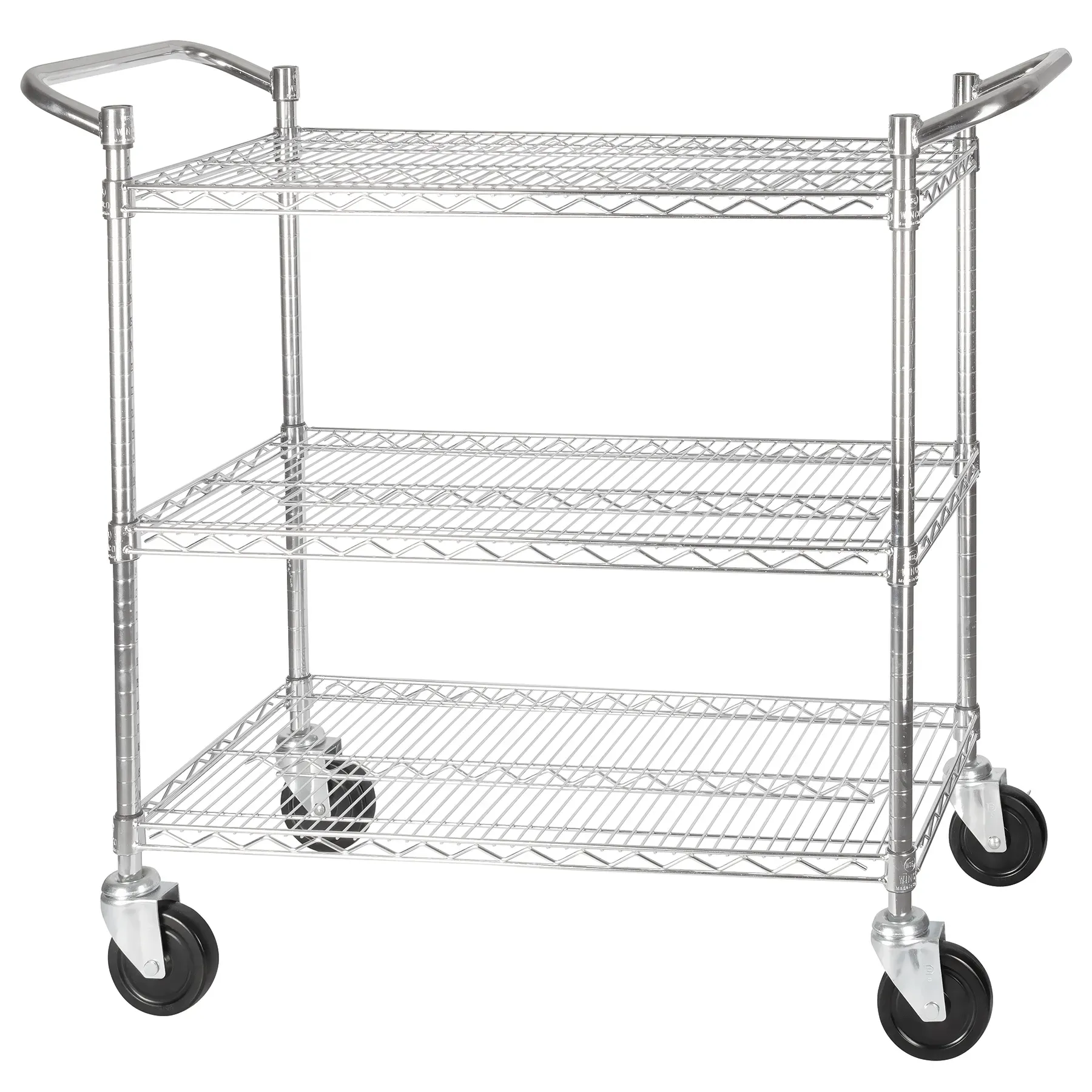The 3-Tier Wire Shelving Cart boasts a chrome-plated finish, providing both durability and a sleek, professional appearance. Its 18x36-inch dimensions offer ample space for storing and transporting a variety of kitchen essentials, from ingredients to utensils, making it a perfect fit for busy restaurant environments.